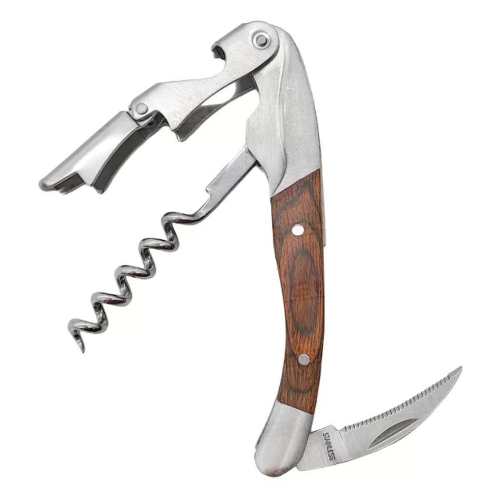 Sacacorcho Destapador Tirabuzon Doble Acción con mango de madera Hudson. Este utensilio multifuncional de acero inoxidable incluye: